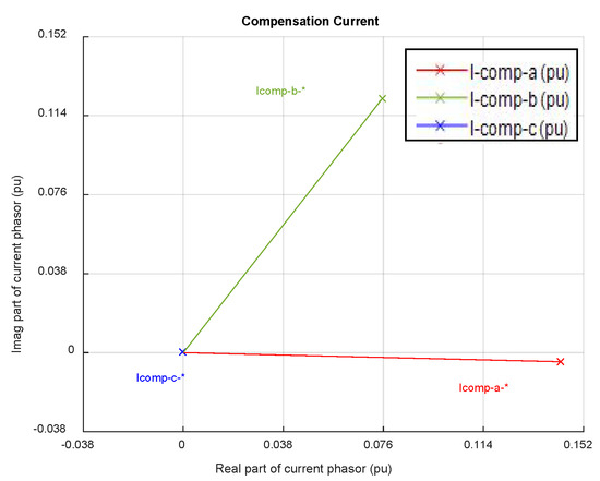 According to Equations (2)–(4), the compensation current, , was calculated as pu, pu, and pu, where the current base was 1312.2 A. These compensated currents are shown in Figure 2 through the current phasor diagram. These currents are also related to the load conditions, where a higher load received a higher compensation current in the phase line at Bus 2. The currents A and B were higher because their loads were higher than average load. The load C was equal to the average load, such that current C was almost zero. Note that the compensation currents were in a negative sequence.