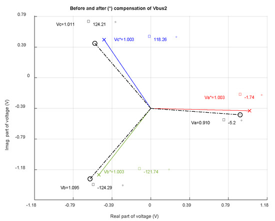 After compensating, the currents of the secondary side of the transformer were balanced. The voltages at the secondary side of the transformer became balanced because of the balanced transformer structure and balanced currents. The phasors of the original and compensated voltages are compared in Figure 3. The compensated voltages were 1.003 −1.74° V, 1.003 −121.74° V, and 1.003 118.26° V, which are shown in red, green, and blue color, respectively. The VUF was improved from 10.56% to 0%. Each phase voltage was 1.003, which is similar to a nominal voltage 1.0 pu, and each phase was shifted by 120°.