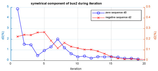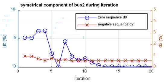 Figure 5 shows the zero-sequence and negative-sequence in each iteration from the PSO algorithm. The scale of the right vertical axis is ten times that of the left vertical axis. The decreased promptly in the beginning and then followed a peak of fluctuations before finally decreasing gradually. The trend of was the opposite of in early iterations, before decreasing gradually in later iterations. A total of 13 iterations were required to achieve and values that were both lower than 1.0%. Furthermore, the minimum values were 0.01% and 0.10% for and respectively, at the end of the simulation. The evolution of the zero sequence and negative sequence showed that they experience opposite changes in the short term and similar changes in the long term.