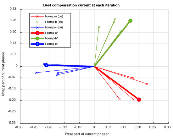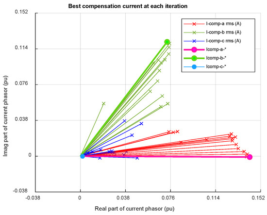 Figure 8 shows the best compensation current of each iteration. The phasors with marker circles were the best values of all iterations; for phases a, b, and c, these were pu, pu, and 0.214 pu, respectively, where the current base was 757.6 A. The current of phase b was larger than other phases, even though the load of phase b was the smallest. The reason is the lack of a transformer connecting to phases a and c, thus, the current of phase b was equal to the sum of currents in phases a and c. The compensation of phases a and c were higher because of the heavier loads, 90% and 80%, respectively. However, the compensation of phase c was smaller because of the smaller load, 70%.