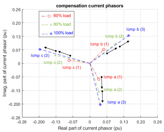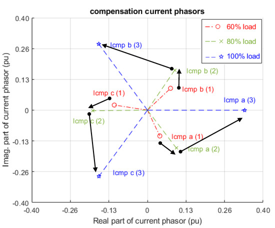 Figure 10 shows the relationship of compensation currents with increasing capacitive loads, where the total loads of three phase were set at 60%, 80%, and 100%. The magnitude of compensation currents increased from 0.12 pu to 0.33 pu. In contrast to the inductive load with a consistent angle, the angle of phasors decreased with increasing load. Thus, the phasors rotated counterclockwise when the load increased.