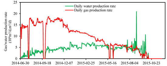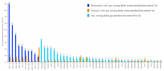 In the zone with retained interlayer water, the proportion of wells that produce water during production testing was shown to be significant. For these wells, gas and water are simultaneously produced, and water production rate variations are large. The water production rate and the probability of water breakthrough for horizontal wells is always larger than those of vertical wells. In the Gaoqiao area, for example, 38 of 150 vertical wells (25.3%) were found to produce water during production testing. The gas production rate was found to be between 0 and 7.97 × 104 m3/d, with an average value of 1.43 × 104 m3/d. The water production rate was found to be 0.5~33.5 m3/d, with an average value of 6.7 m3/d. In contrast, 10 of 18 total horizontal wells (55.5%) were found to produce water. The gas production rate for these wells was calculated as 0.86~20.41 × 104 m3/d, with an average value of 5.6 × 104 m3/d. The water production rate was calculated as 8~90 m3/d, with an average value of 31.0 m3/d. An illustration of these statistical results is shown in Figure 2. These results can be attributed to the chances of encountering water-rich zones. The probability of drilling into water-rich areas during acid fracturing is low for the vertical wells but high for the horizontal wells. Furthermore, the improvement of reservoir stimulation during production testing has been shown to be able to increase the gas production rate and water production.