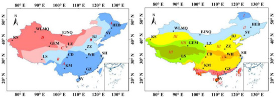 Geographical locations of the Rs stations in the different humidity zones (left) and temperature zones (right) of China (A for humid, B for semihumid, C for semiarid, D for arid; I for cold temperate, II for midtemperate, III for warm temperate, IV for north subtropical zone, V for the midsubtropics, VI for the south subtropics, VII for the edge of tropical zone, HI for plateau subfrigid zone, HII for plateau temperate zone, and IIE for midtropical zone with humid weather).