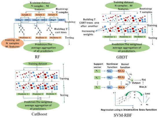 It should be noted that existing studies have shown that the above tree-based methods, such as RF, may encounter an over-fitting problem, i.e., the phenomenon where the model performs well on the training data but poorly on the testing data [38]. Some models may be costly in computational time, i.e., the computational process of models will run inefficiently. Recently, a newly developed tree-based ensemble model, namely, extreme gradient boosting (XGBoost), proposed by Chen and Guestrin [39], has been widely applied in many other fields [40], because it showed better stability and a higher computational efficiency with satisfactory accuracy. For example, Fan et al. [41] applied various artificial intelligence algorithms (including XGBoost and GBDT) to predict daily reference evapotranspiration (ETo), and it was found that the XGBoost and GBDT algorithms showed higher computational efficiency and acceptable stability and accuracy compared to the other four models (SVM, ELM, RF and M5tree).