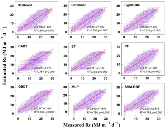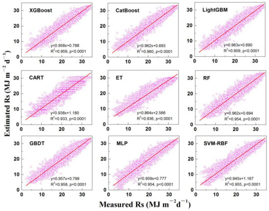 The physical transmission models take into consideration the physical process, which provides alternative ways to predict Rs: for example, Gueymard [13,14] proposed a physically based model for estimating the diffuse and clear-sky beam. Yang et al. [15] and Yang et al. [16] developed a hybrid model to estimate the hourly, daily, and monthly Rs. Qin et al. [17] also developed an efficient physically based parameterization radiation model to estimate Rs in different sky conditions. Sun et al. [18] and Sun and Liu [19] proposed a fast scheme called SUNFLUX for estimating Rs based on the full radiation scheme, and the results showed that the accuracy of SUNFLUX for 30-minite data was in good agreement with observations. Tang et al. [20] employed the fast parameterization scheme to estimate instantaneous and daily Rs based on MODIS products, and the R2 and RRMSE values for daily Rs were 0.92 and about 16%, respectively. However, previous studies have shown that their accuracy need to be further improved compared to machine learning models. For instance, Chen et al. [4] compared the accuracy of different machine learning models and Yang’s hybrid model and found that the latter performed worst among all models. Qin et al. [21] applied eight artificial intelligence (AI) models and four physically based models to estimate daily photosynthetically active radiation (PAR) in China; the results showed that the four physically based models performed worse than the eight AI models. Moreover, these physical transmission models often simulate interaction between Rs and the atmosphere, and this simulation requires many input variables (e.g., moisture, surface albedo, and aerosol optical depth) that are difficult to obtain. It is apparent from the calculating process that the model performances depended on input meteorological variables.