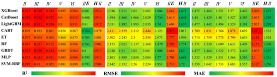To simplify the results of comparison, we select five typical stations in contrasting climatic zones to present the performance of various models (Tables S1, S4, S7, S14 and S16). Table S1 provides the comparisons of the MLP, SVM-RBF and various tree-based ensemble models for Sanya station. This station performed the worst among all stations in humid regions of South China. For example, the R2 values of MLP, SVM-RBF, CART, ET, RF, GBDT, XGBoost, CatBoost and LightGBM models ranged from 0.775–0.795, 0.777–0.798, 0.755–0.782, 0.779–0.797, 0.727–0.791, 0.705–0.806 and 0.739–0.814, respectively; RMSE values ranged from 2.711–2.823, 2.680–2.820, 2.797–2.963, 2.700–2.813, 2.727–3.127, 2.622–2.947 and 2.569–3.046 MJm−2d−1, respectively; and MAE values ranged from 2.105–2.199, 2.095–2.162, 2.184–2.292, 2.124–2.212, 2.125–2.398, 2.043–2.280 and 2.000–2.350 MJm−2d−1, respectively. Table S4 presents the comparisons of all the models at Wuhan station. The R2 values of MLP, SVM-RBF, CART, ET, RF, GBDT and the three newly developed tree-based ensemble models ranged from 0.888–0.910, 0.881–0.897, 0.880–0.895, 0.883–0.892, 0.854–0.903, 0.890–0.915 and 0.887–0.918, respectively; RMSE values ranged from 2.243–2.511, 2.407–2.585, 2.422–2.600, 2.457–2.561, 2.323–2.863, 2.171–2.476 and 2.127–2.511 MJm−2d−1, respectively; and MAE values ranged from 1.655–1.908, 1.808–1.961, 1.831–1.986, 1.885–1.966, 1.735–2.155, 1.614–1.869 and 1.572–1.901 MJm−2d−1, respectively. Table S7 shows the training and testing accuracy of all models at Haerbin station. The R2 values of MLP, SVM-RBF, CART, ET, RF, GBDT and the three newly developed tree-based ensemble models ranged from 0.913–0.924, 0.917–0.922, 0.895–0.897, 0.904–0.908, 0.894–0.921, 0.915–0.928 and 0.913–0.930, respectively; RMSE values ranged from 1.965–2.098, 1.988–2.046, 2.298–2.321, 2.168–2.208, 2.007–2.331, 1.911–2.078 and 1.880–2.103 MJm−2d−1, respectively; and MAE values ranged from 1.450–1.561, 1.471–1.506, 1.720–1.740, 1.625–1.622, 1.484–1.716, 1.424–1.534 and 1.393–1.550 MJm−2d−1, respectively. Table S14 shows the training and testing accuracy of all models at Geermu station in the Plateau and Mountain climatic zones, respectively. The R2 values of the MLP, SVM- RBF, CART, ET, RF, GBDT and the three newly developed tree-based ensemble models ranged from 0.951–0.957, 0.955–0.957, 0.932–0.933, 0.934–0.940, 0.943–0.954, 0.956–0.959 and 0.955–0.961, respectively; RMSE values ranging from 1.465–1.569, 1.461–1.510, 1.838–1.845, 1.738–1.812, 1.515–1.691, 1.440–1.490 and 1.405–1.505 MJm−2d−1, respectively; and MAE values ranging from 1.052–1.122, 1.043–1.068, 1.379–1.382, 1.308–1.379, 1.093–1.205, 1.037–1.069 and 1.010–1.076 MJm−2d−1, respectively. Table S16 presents the comparisons of all models at Ejinaqi station in the arid temperate continental climatic zone. Ejinaqi station had the best performance, with R2 values of MLP, SVM-RBF, CART, ET, RF, GBDT and the three newly developed tree-based ensemble models ranging from 0.946–0.955, 0.951–0.956, 0.933–0.934, 0.929–0.938, 0.937–0.950, 0.950–0.957 and 0.948–0.959, respectively; RMSE values ranging from 1.601–1.744, 1.575–1.667, 1.939–1.948, 1.872–1.997, 1.675–1.881, 1.561–1.680 and 1.522–1.711 MJm−2d−1, respectively; and MAE values ranging from 1.146–1.262, 1.122–1.195, 1.433–1.439, 1.397–1.499, 1.195–1.348, 1.119–1.210 and 1.090–1.226 MJm−2d−1, respectively.