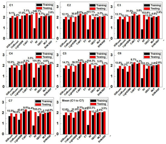 The RF and LightGBM models performed significantly superior to the other models in the training stage (marked in red or bold in Tables S1–S16). However, the CatBoost and LightGBM models generally performed better than the other models in the testing stage, and the GBDT and XGBoost models also provided comparable performances to the CatBoost and LightGBM models (marked in bold or colors in Tables S1–S16). The mean training and testing RMSE of 16 stations are shown in Figure 7 for all models under various input combinations. It was obvious that the three newly developed tree-based ensemble models (CatBoost, LightGBM, XGboost) and GBDT model had the best prediction accuracy in the testing stage for all input combinations, whereas the CART, ET and RF provided higher RMSE values. Meanwhile, the increasing percentage in testing RMSE over training RMSE (average for all sixteen stations) under seven input combinations is also exhibited in Figure 7. The figure indicates that ET, MLP and SVM-RBF models were the most stable models with smallest increases in testing RMSE (from 3.5% to 4.4%). On the contrary, the RF model was the most unstable model with the largest increase in testing RMSE (152.3%). This suggested that the RF model encountered a serious over-fitting problem. Moreover, the CART, GBDT, XGBoost, CatBoost and LightGBM models also showed acceptable percentage increases (on average, from 8.3% to 31.9%) in testing RMSE, indicating that the above models didn’t encounter an over-fitting problem and had comparable model stability.