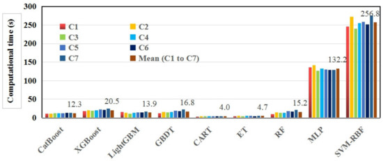 Figure 8 shows the average computational time of the various developed algorithms under seven various input combinations for all stations in training stages in the Python computing environment (version 3.6). It is clear that the average computational time cost by the SVM-RBF (256.8 s) and MLP (132.1 s) were much higher than the other tree-based ensemble models (less than 21 s) under seven input combinations. In particularly, CART and ET showed the highest computational efficiency with 4 s and 4.7 s, respectively. Meanwhile, CatBoost, LightGBM, XGBoost, GBDT and RF also showed comparable computational efficiency (from 12.3 s to 20.5 s) to CART and ET. In general, it is clear that the average computational time depends on the specific model.