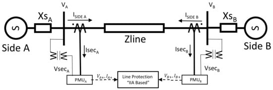 The IIA protection method as described in [14,15] uses the positive sequence phasors of voltages and currents of PMUs installed at both ends of a line, as can be seen in Figure 1.