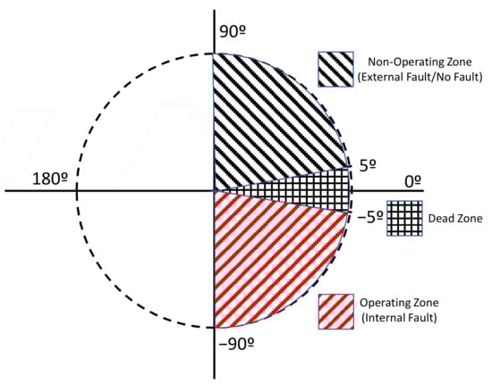 Note that the operating characteristic in Figure 5 is different from the one defined in Figure 2 [14]. The new operating characteristic was defined after observing the behaviour of the IIA angle scheme while protecting a line or a zone with different kinds of fault conditions. Internal zone faults result in a zone with an angle between 5° and 90°, while external zone faults result in a zone with between −5° and −90°. This behaviour will be further explained in Section 6 and Section 7.