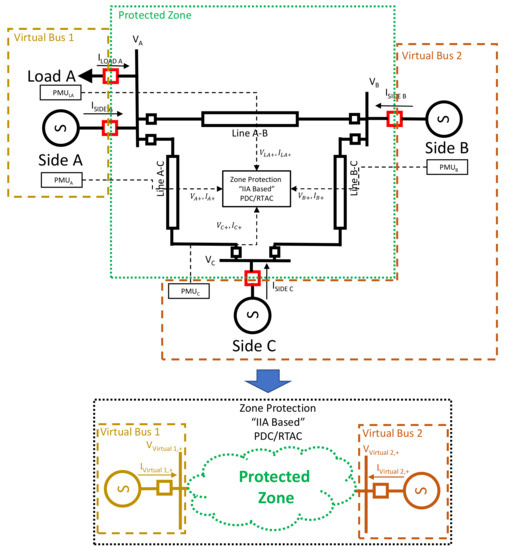 The proposed method merges the IIA protection scheme [14] with the application of the theory of the virtual bus [16] using the positive sequence phasors of voltages and currents measured by the PMUs located in the limits or the border and considering all power inputs and outputs of the zone to be protected. In Figure 4 a general scheme of the proposed method can be observed.