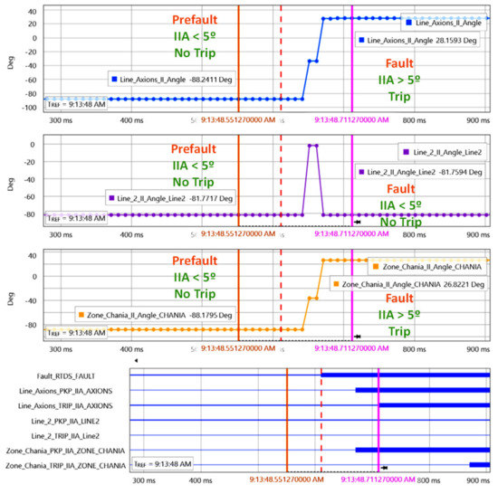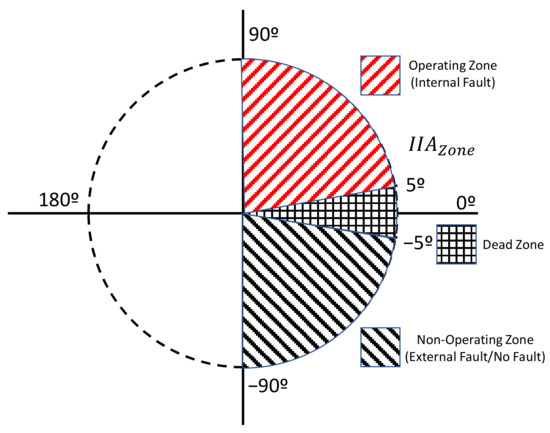 The sign of the IIA applied to a line and the applied in a zone to be protected, in an operating condition without fault, has a negative value near −90°. When an internal fault occurs, this angle changes to a positive one greater than 5° and lesser than 90°. This behaviour is consistent with the operating characteristics of the protection scheme represented in Figure 5, and has been observed during the tests performed with the algorithm.