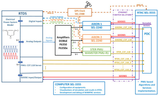 In Figure 7, a diagram of the real-time PMU laboratory can be observed. In this setup, it is possible to use the RTDS to model electrical power systems that interact by means of hardware in the loop simulations, using real equipment, control systems, and electrical protection schemes. Therefore, it is a very convenient setup to test WAMPAC services and algorithms before their implementation in the field.