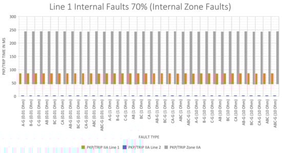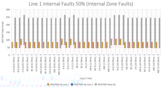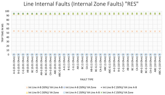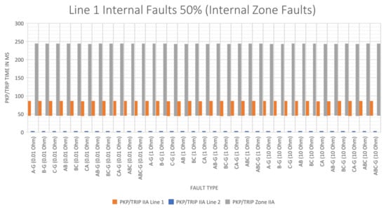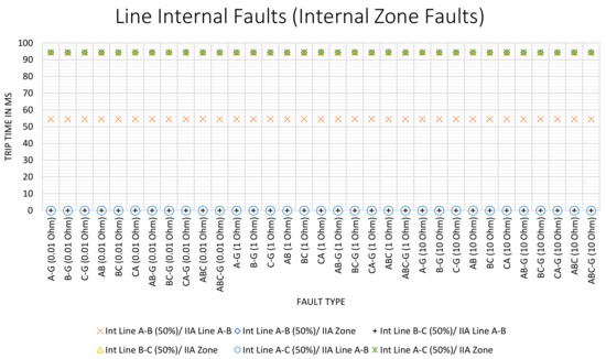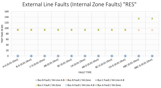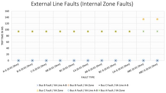 As far as external zone faults and external line faults are concerned, different types were executed, namely A-G, B-G, C-G, AB, BC, CA, AB-G, BC-G, CA-G, ABC, and ABC-G, with a fault resistance of 0.01 Ω.