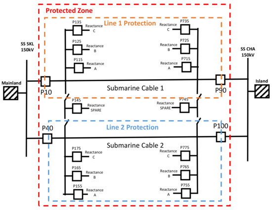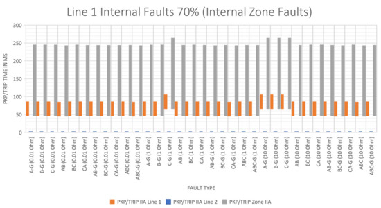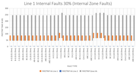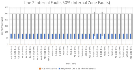 All in all, 330 tests have been executed using this power system. In all of them, a good behaviour of the protection method was observed. Furthermore, internal zone faults were detected, and trips were generated, and in the presence of external zone faults, the method is stable and did not generate any undesired trips. With these test results, it is concluded that Line IIA and protection methods work correctly as backup protections for the 150 kV Line 1 and 150 kV Line 2 between “SS SKL” and “SS CHA”.