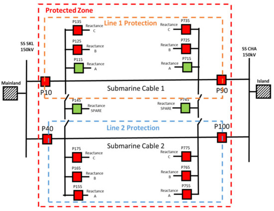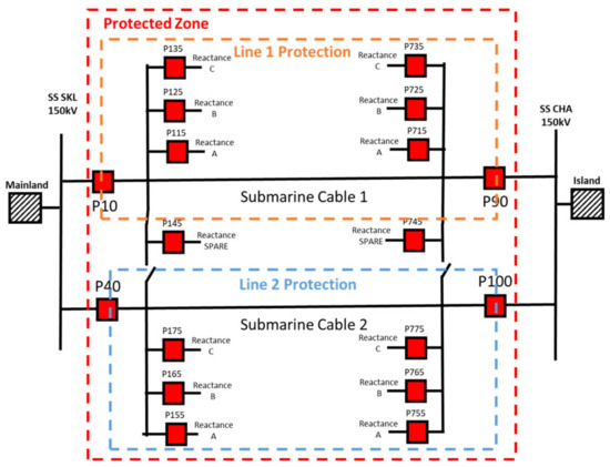 Typically, transmission systems are protected by differential relays (87) as primary protections, and distance relays as backup protections (21). In distribution systems the main protections are the overcurrent relays (50, 51, 67) but, with the increasing presence of renewable generation on the load side, this protection philosophy must change to a new one including differential relays, distance relays, and new protection algorithms specifically developed by this kind of power systems [11,12,13].
