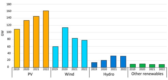 Ensuring access to sustainable and reliable energy is crucial to achieving social and economic development []. A large percentage of the global energy demand is covered by fossil fuels, which have a negative environmental impact. When fossil fuels are burned, toxic greenhouse gasses are released into the atmosphere, endangering people’s health and causing climate change []. Furthermore, over the past years, there has been increasing concern about running out of fossil fuels because they are non-renewable sources []. For these reasons, it is vital to cover the energy demand using renewable energy resources (RESs) such as wind, hydro, solar, geothermal, biomass, etc. RESs offer viable indigenous alternatives to conventional energy sources since they are secure, economically competitive, clean, and sustainable []. The use of RESs in producing electricity would help minimize energy imports and fossil fuel use, which are presently utilized in several applications, such as providing power for community and household buildings, pumping, irrigation, and other purposes []. The high rate of renewable energy capacity expansions was maintained in 2021, with an additional value of 270 GW. Moreover, this expansion is likely to continue in 2022, with an expected value addition of around 280 GW. Around 90% of the power capacity increase in 2021–2022 comes from RESs. This increment is about 50% higher than the capacity additions of 2017–2019. Net renewable capacity additions from 2019 to 2022 are depicted in Figure 1 [].