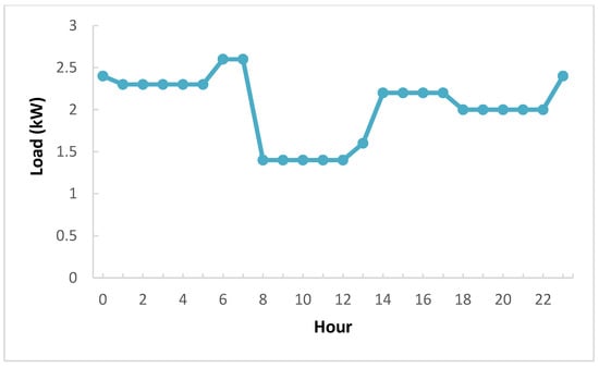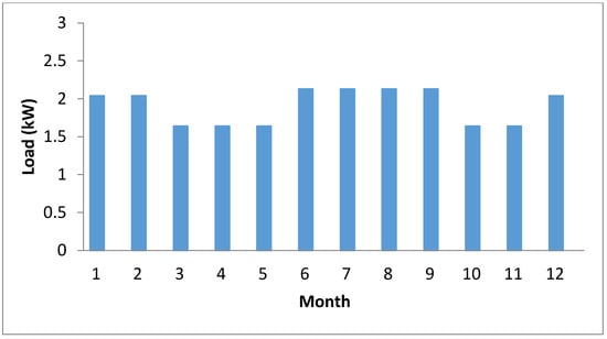 The present work was conducted in Karbala, Iraq, where a residential home was selected as a case study. Karbala, like other cities in Iraq, suffers from widespread power cuts and has only a few hours of electricity daily. The estimated hours of operation, quantity, and component type were used to construct the electrical load of the selected house. The daily load profile in the summer season is depicted in Figure 2. However, the daily load profile changes based on weather conditions. Figure 3 shows the monthly load profile. The daily energy load is approximately 46.89 kWh, with a peak demand of 2.77 kW.