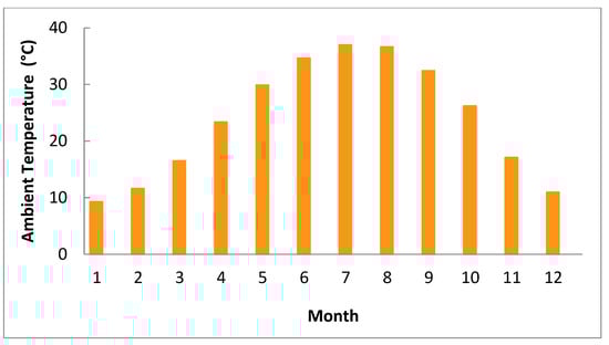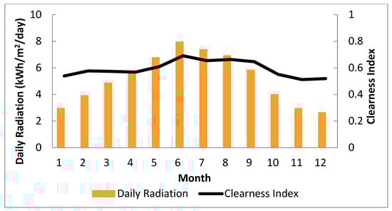 Solar farm location is a top priority for planners because it is crucial to the success of energy projects. Iraq is rich in solar energy, putting it at the forefront of countries capable of using solar energy to produce electricity. The direct normal radiation ranges between 1800 and 2390 kWh/m2/year []. HOMER used the monthly average temperature and global horizontal radiation as input parameters. The average ambient temperature varies between 9.28 °C in January to 36.97 °C, with an annual average temperature of 23.81 °C (Figure 4). The monthly average solar radiation and clearness index is depicted in Figure 5. The yearly average solar radiation at the site is 5.16 kWh/m2/day, and it varies from 2.64 kWh/m2/day in December to 7.94 kWh/m2/day in June. Data on the ambient temperature and solar radiation are taken from NASA [].