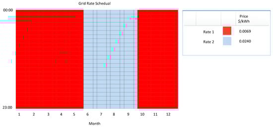 The grid power price in Iraq is estimated based on monthly electricity consumption, as shown in Table 3 []. The national grid scheduled rates for each month are shown in Figure 7. There are two rates, $0.0069/kWh for low demand and $0.024/kWh for high demand.