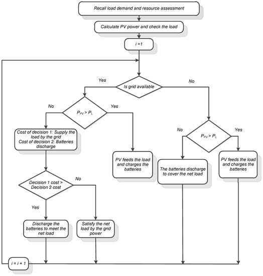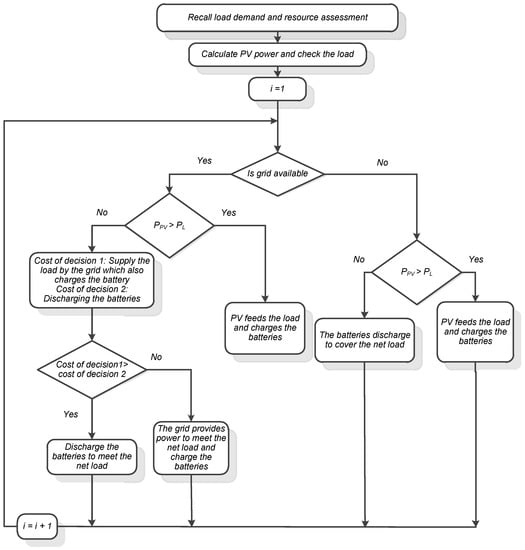 Optimizing hybrid generation systems requires a suitable control strategy to control the electricity production, storage, and energy flow among components. In HOMER software, users select their control strategy, which affects the outcome of the optimization results dramatically. In the present work, LF and CC control strategies were implemented for optimization. Both approaches decided on the most cost-effective manner of feeding the load at each step. Predicting the most effective option prior to running the model is challenging. In the LF strategy, the national grid is responsible for covering the required load only, without charging the battery, which can be charged only by surplus PV power. Figure 8 shows the control algorithm of the LF strategy, while by using CC as a control strategy, the national grid can cover the required load besides charging the battery for later use. The control algorithm of the CC strategy is depicted in Figure 9.