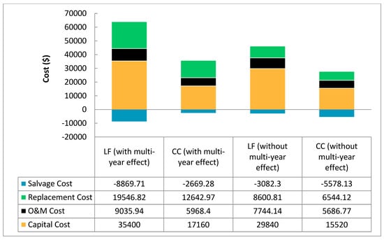 This study examined the optimal design of the grid-connected PV system to electrify a residential house based on the lowest NPC. HOMER software was used to simulate and optimize all possible combinations. An hourly time series simulation was performed for each feasible HES to examine the technical and economic feasibility to obtain the best feasible economic scenario. The optimization results for the HES using different control strategies are depicted in Table 5. It is evident from the results that the optimal HES is achieved by using the CC strategy. When considering the effects of the multi-year parameters, the optimal design using the CC strategy consists of 7 kW PV, 20 batteries, 4 kW converter with average power grid purchases of 11,675 kWh/year. In this scenario, NPC is calculated as $33,102, which is 23.7% more expensive than the system using the CC strategy without considering the multi-year parameters that comprise 6 kW PV, 18 batteries, and a 4 kW converter with average power grid purchases of 11,995 kWh/year. On the other hand, the LF strategy is much more expensive than the CC strategy. The system using the LF strategy with the effect of multi-year parameters consists of 23 kW PV, 36 batteries, 4 kW converter, and average power grid purchases of 6215 kWh/year. The NPC of this option is estimated at $55,113, which is 35.7% higher than the NPC of the system using LF strategy without considering the multi-year parameters that consist of 19 kW PV, 30 batteries, 4 kW converter with power grid purchases of 6299 kWh/year. This finding is mainly due to the fact that by considering the effects of multi-year parameters, such as PV and battery degradation, higher PV and battery capacity are required to compensate for the loss of power resulting from the degradation. Moreover, the study assumed that the battery must be replaced when the degradation exceeds 30% of the battery capacity, which leads to an increase in the replacement cost. All these factors result in increasing the NPC. The cost summary of the suggested hybrid generation configuration using LF and CC strategies with and without the effect of multi-year parameters is provided in Figure 10.