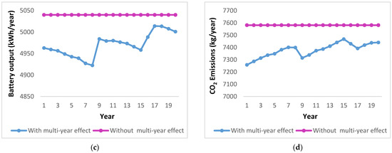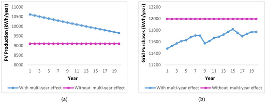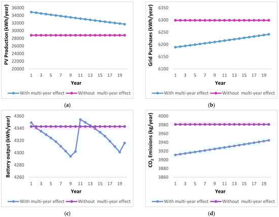 The multi-year model takes into account the changes that occur throughout a project. The simulation is carried out every year during the project’s life. When neglecting the multi-year effects, a one-year simulation is carried out, and the results are extrapolated over the remainder of the project’s lifespan. Figure 11 and Figure 12 show the year–year analysis using the LF and CC strategies, respectively. The results indicate that by neglecting the multi-year effects, the values of PV production, grid purchases, battery output energy, and CO2 do not show any variation for the project’s lifetime. On the other hand, when considering the multi-year effects, PV production decreases over the years, mainly due to the effects of degradation. This leads to increasing the grid purchases and hence increasing the CO2 emissions. For the LF strategy, the PV production decreases from 34,882.46 to 31,713.61 kWh/year after 20 years, leading to an increase in grid purchases from 6188.8 to 6241.54 kWh/year and CO2 emissions from 3911.2 to 3944.65 kg/year. In the case of the CC strategy, the PV production decreases from 10,616.4 to 9651.97 kWh/year, leading to increased grid purchases from 11,483.6 to 11,771.9 kWh/year and CO2 emissions from 7286.29 to 7439.84 kg/year with some fluctuations among years. Moreover, the results show that the battery output energy decreases for certain years due to the battery degradation and then suddenly increases again, which relates to the battery replacement.