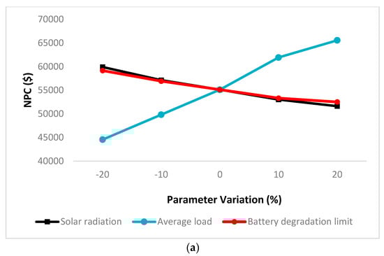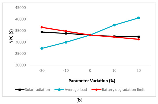 The effects of some critical parameter variations on the NPC concerning the multi-year effects are discussed in this section. The sensitivity analysis of the solar radiation, average load, and battery degradation limits considering −20% and +20% variations of the original value of each parameter are depicted in Figure 13. It is obvious that the variation of the solar radiation from −20% to +20% of its original value leads to a decrease in the NPC by 13.8% and 5.9% for LF and CC, respectively. The same variation rate in the average load increases the NPC by 47.1% and 48.6% for LF and CC, respectively. Moreover, the NPC decreases by 11.2% and 14.2% for LF and CC, respectively, with the same variation ratio in the battery degradation limit.