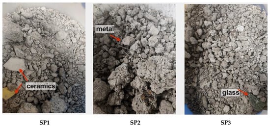 Material from a municipal waste incineration plant was collected to carry out the planned research. Slag and bottom ash, which according to [] are classified as non-hazardous waste, were analyzed. These are the dominant types of waste produced by incineration plants, and for this reason, other possibilities for its use are sought. Three groups of slag and ash were collected at different time intervals for research purposes. The oldest material (SP1) was seasoned for over 9 months, the next (SP2) for about 4 months, and the latest (SP3), at the time it was obtained, for 1 month. Prior to sampling, the material was each time subjected to the process of initial crushing and recovery of ferrous and non-ferrous metals (the so-called valorization process). Macroscopically, the SP1, SP2, and SP3 material showed no significant differences. They were gray loose conglomerates of various grain sizes, in which fragments of ceramics, metals, and glass were sometimes visible (Figure 1). The average natural humidity of the delivered slag sample was 10.95%.