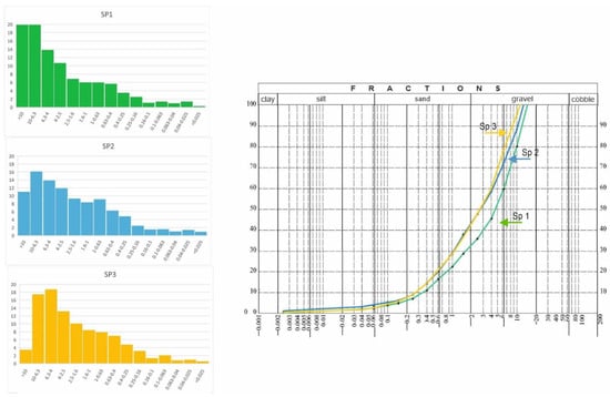 Figure 5 shows histograms and particle size distribution curves. It was shown, in all analyzed materials, that the gravel fraction dominated, followed by the sand fraction, while the dust fraction had the smallest share in the structure of waste material (Figure 5). Together with seasoning time, the material had a higher percentage of the gravel fraction. The largest amount of material above 10 mm was found in SP1, i.e., the oldest tested slag (20%); in SP2 it was about 11%, and in the youngest, SP3, it was only 3.5%. Although the material showed similar properties, there was a visible relationship between the seasoning time and the content of the thickest fraction. This feature was most likely the effect of caking of the material along with the lengthening of the slag and ash seasoning time. The seasoning process consists of penetration of moisture contained in the air into slag grains, where hydration processes take place. On the other hand, the hydration process consists of joining water to anhydrous compounds contained in slag grains (e.g., transition of CaSO4 into CaSO4 × 2H2O).