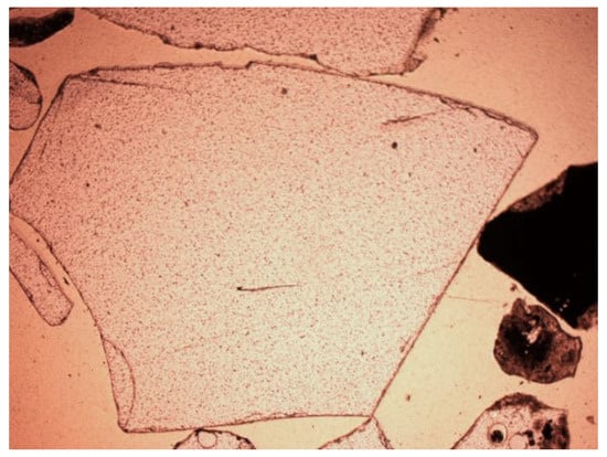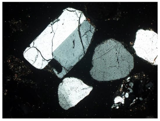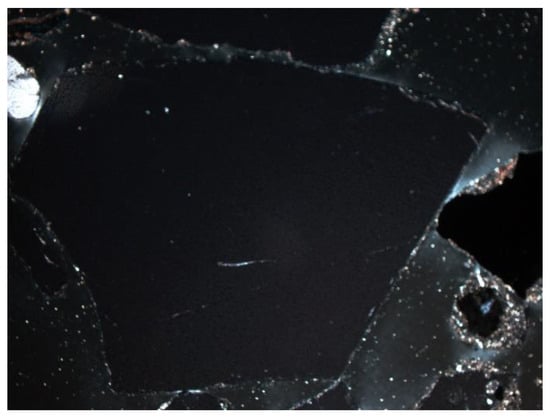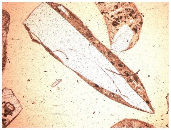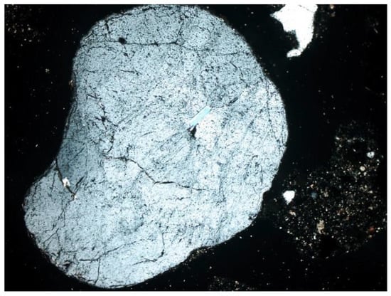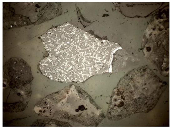 - Feldspars—spatial aluminosilicates of K, Na, and Ca, and less often Ba. Numerous grains of potassium feldspar and plagioclase were found in the samples. All feldspars had gray, low first-order interference colors, visible cleavage, and multiple or singly twinned crystals. The group of feldspars includes a number of minerals with different chemical compositions and different forms of crystals. In the analyzed slag and ash samples, sometimes numerous grains of potassium feldspars and plagioclases were found. The crystal habit was often subhedral, tabular. The material showed, for example, multiple twinned plagioclases (Figure 10) and potassium feldspars—microcline (Figure 11) and orthoclase (Figure 12 and Figure 13).