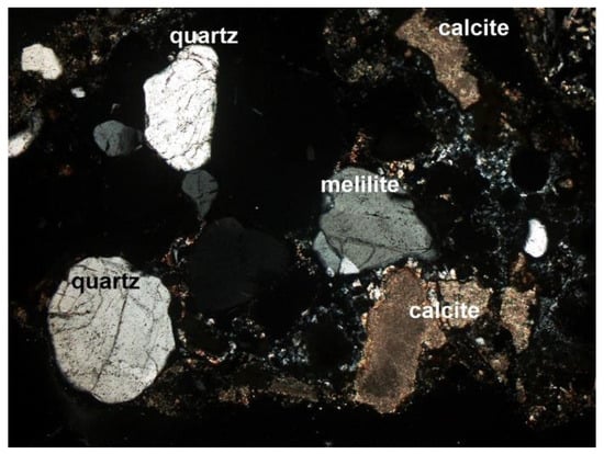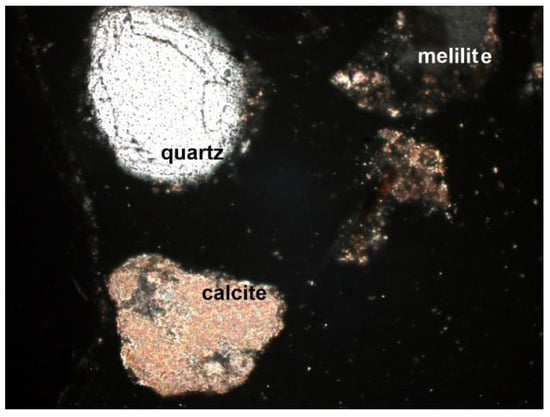 Figure 9. Quartz, calcite, and melilite in the SP2 sample, thin section, 2P, 100×, transmitted light.