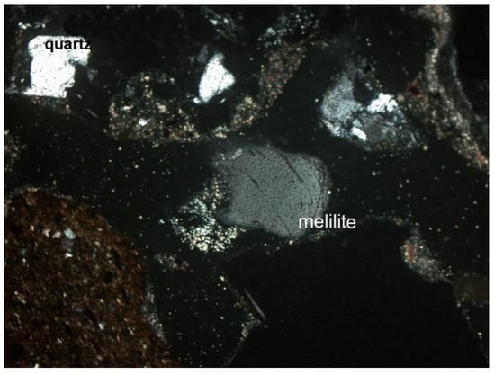 Figure 8. Melilite and quartz grains (SP1 sample), thin section, 2P, 100×, transmitted light.