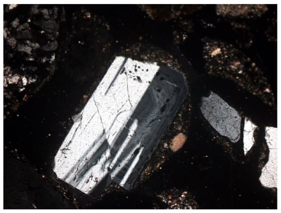 Figure 10. Plagioclase—visible multiple twinning and residual zonal structure. SP3 sample, thin section, 2P, 100×, transmitted light.