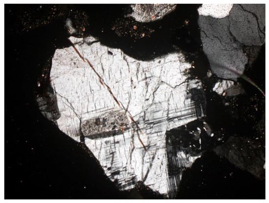 Figure 11. Microcline (K-feldspar) with visible twinning in two directions. SP3 sample, thin section, 2P, 200×, transmitted light.