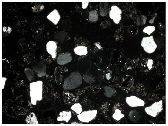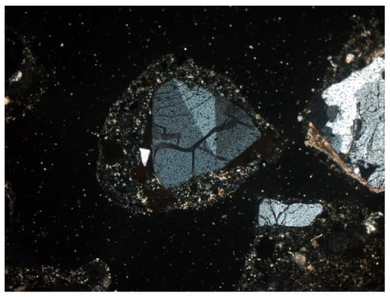 - Quartz (SiO2): the dominant component of the mineral phase in each sample. It was in the form of oval, rounded, slightly cracked grains (Figure 6, Figure 7, Figure 8 and Figure 9). It showed gray interference colors of the first order. This mineral, due to the action of high temperature, showed wavy dimming.
