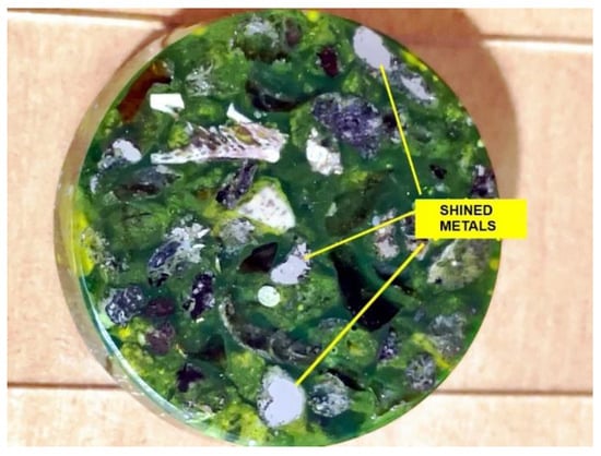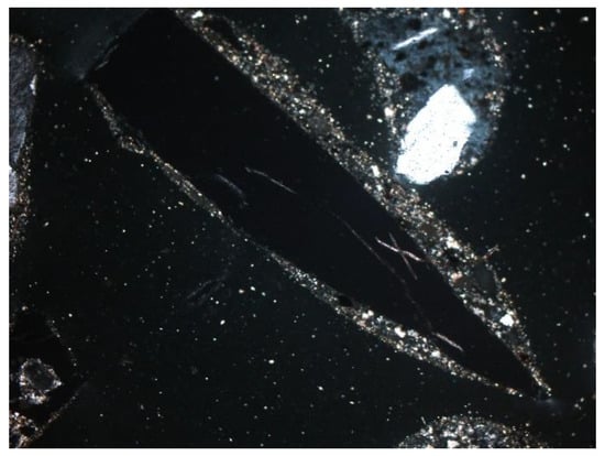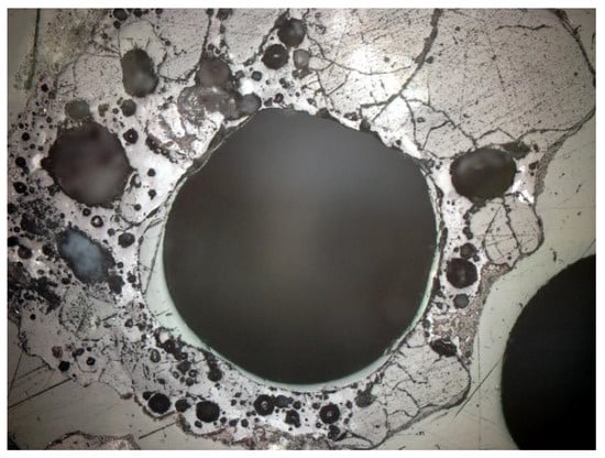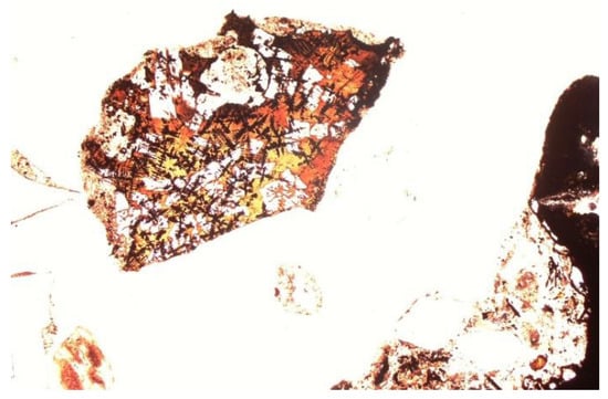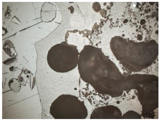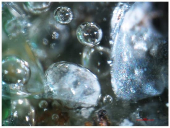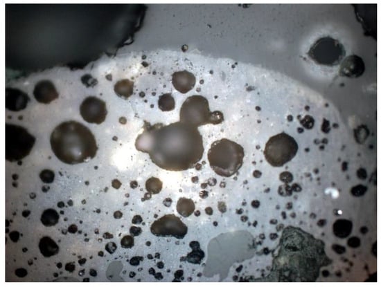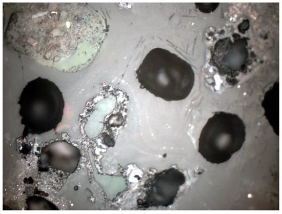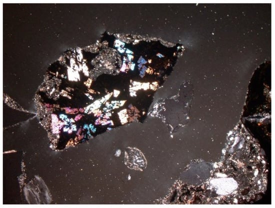 Other minerals were also found in the slag and ash, such as apatite, anhydrite or gypsum, and wollastonite. As for the amorphous phase, each sample contained a significant amount of anthropogenic materials unchanged in the combustion process, which have not been completely burned. These are mainly fragments of glass, which were observed even with the naked eye (Figure 1). Fragments of glass or enamel in polarized light are optically isotropic (they completely extinguish the light) (Figure 14, Figure 15, Figure 16 and Figure 17). In addition, a significant content of the metallic phase was found, composed of shiny fragments of various metallic substances not separated in the recovery process (Figure 18, Figure 19, Figure 20 and Figure 21). These substances were opaque and isotropic in the transmitted light microscopic analysis (Figure 20 and Figure 21). Fragments of metals originated from cans (Figure 22, Figure 23 and Figure 24) and various unidentified, not fully burnt fragments (Figure 25) were shown.