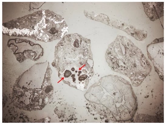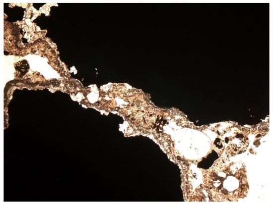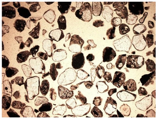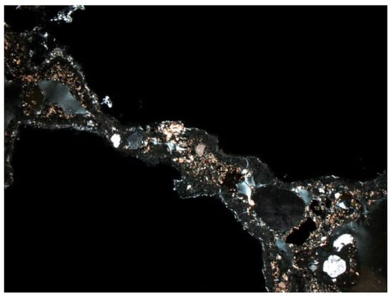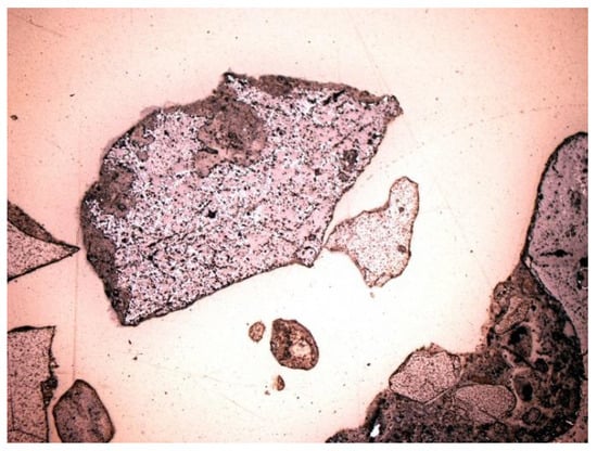 Depending on the analyzed fraction, differences were observed not only in porosity, but also in the phase composition of the material itself. The thicker fractions were dominated by amorphous substance (Figure 14 and Figure 15). There was a lot of glass and other slag fragments that were difficult to identify microscopically, but there was relatively little mineral substance. As the fraction decreased, microscopic analyses revealed an increase in the mineral substance in which quartz was definitely dominant (Figure 33 and Figure 34).