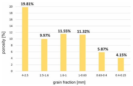 According to Table 4, passing from the thicker SP2 fraction (>6.3 mm) towards the finer fraction, the share of closed pores decreased, and the share of open pores increased in the total porosity of the sample. The reduction in the size of the sieved fraction was associated with a transition from macropores, which were typical for fractions >6.3 mm, towards equal shares of closed and open pores in the 1.0–2.5 mm and 0.63–1 mm fractions, to a dominant share of micropores in the 0.25–0.63 mm grain fraction. The sample with the finest grains had the lowest percentage of closed pores.