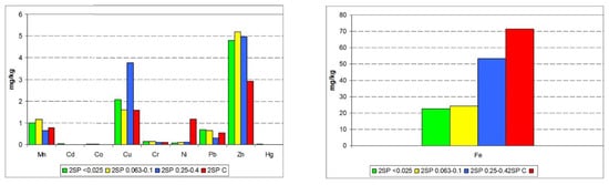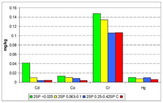 The approximate total content of selected metals in the studied waste samples was determined (Figure 35). Alike in SP2 sample and in the grain fractions separated from it, metals were present at a very low level. With the exception of Co, Cd, and Cr, there was no relationship between the grain size and the content of metals. The Fe content was the highest in the primary sample SP2. There was no significant relationship between Fe content in the samples and the metal content in them. The exception was Ni.