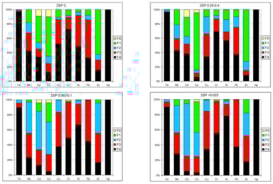 A sequential four-stage BCR chemical extraction of the SP2 sample was performed for selected heavy metals, namely, Fe, Mn, Cd, Co, Cu, Cr, Ni, Pb, and Hg. The BCR method was developed by the European Community Bureau of References [,]. Sequential extraction allows one to determine the susceptibility to metal release of samples associated with the solid phase into the environment and their behavior in the water–soil environment as well as their handling. Sequential extraction consists of treating samples of slag and ash with aqueous solutions of increasing aggressiveness. The extraction solution isolates only one form of the element in the sample. In the sequential extraction process, exchangeable (F1), reducible (F2), oxidizable (F3), and residual (F4) fractions can be separated. The studies were preceded by the determination of the fraction (F0) as the content of the most labile metals bound very weakly in the structure of the solid phase, e.g., in pore solutions or water-soluble compounds using the leaching test according to []. The metals contained in F0–F2 fractions could be treated as mobile and with small changes in pH could be released into the water and soil environments. The metals in the F3 fraction belonged to the mobilizable fraction, which are very difficult to release into the environment, while the metals in the F4 fraction were bound in the structure of minerals.