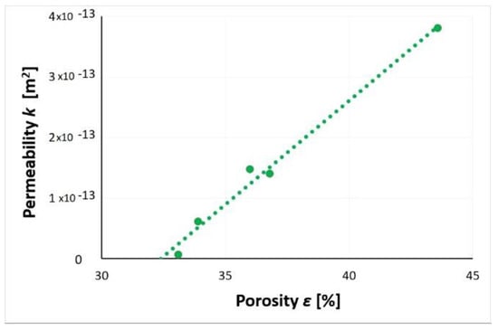 Figure 37 presents the influence of the waste layer porosity on its gas permeability. The obtained dependence showed the proportionality of the analyzed parameters. The increase in porosity resulted in an increase of the slag and ash permeability to nitrogen. A significant reduction in waste porosity was associated with a significant reduction in permeability. By reducing the porosity of the waste layer to 33%, the material’s initial permeability of 3.8 × 10−13 m2 was reduced by two orders of magnitude to 5.8 × 10−15 m2. The slag and ash can be regarded as material with a very low permeability to nitrogen. A simple test confirmed that the porosity of SP2 layer had a dominant influence on the possibility of gas penetration through the soil medium.