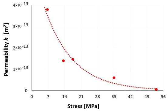 Figure 38 presents the results of the nitrogen permeability tests performed. The average gas permeability k of the studied waste was 1.5 × 10−13 m2. The increase in stress applied to the sample resulted in a denser and less porous waste layers that contributed to the reduction of the slag and ash permeability. At 53 MPa, waste permeability was negligible and significantly limited by the stress state. The trend presented in Figure 38 shows that an increase in the stress exerted on the sample lead to a reduction of the nitrogen permeability or total impermeability of the waste layer. This issue requires further research.