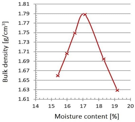 Figure 39 shows the density curve of slag and post-process ash. The value of the maximum bulk density was 1.79 g/cm3, with an optimum humidity of 17.1%. Table 6 presents a summary of the obtained results of the slag and ash filtration coefficient tests immediately after incineration and, respectively, after 3, 6, and 11 months of storage [].