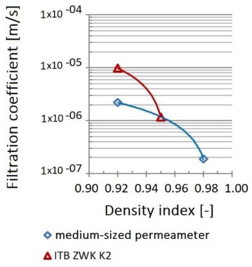A similar relationship was obtained during measurements with the ITB ZW K2 apparatus. With density index increase from IS = 0.92 to 0.95, the value of the filtration coefficient decreased from 1.40 × 10−6 to 1.18 × 10−6 m/s. Tests with IS = 0.98 index could not be carried out for technical reasons (measuring range of the apparatus was exceeded).