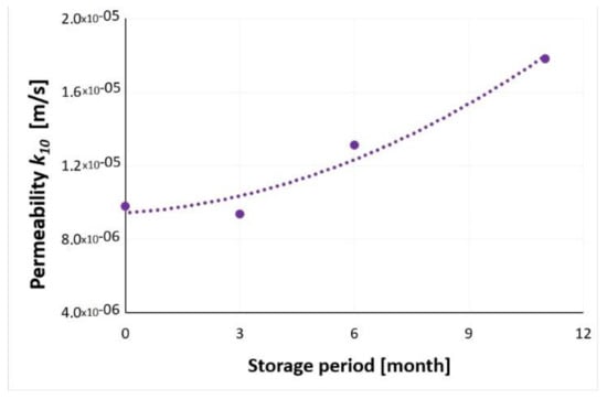 Permeability tests were carried out with two vertical directions of water flow through the sample, i.e., “bottom-up” and “top-down”. Measurements were made after filtering the water through the sample and stabilizing the flow with a constant hydraulic gradient at regular intervals. During the measurements, water temperature and differences in water levels in the piezometric tubes were controlled. The value of the filtration coefficient was assumed as the arithmetic mean of the measurement results obtained for both directions of water flow through the sample. The obtained filtration coefficients (kt) from both devices were converted to the conventional temperature of 10 °C (k10).