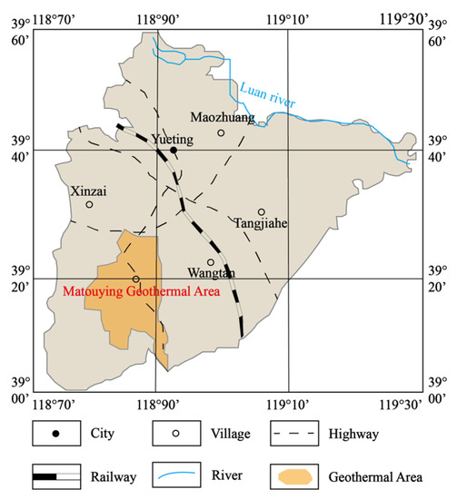 The Matouying uplift area is located in the eastern part of Hebei Province and is a low plain area with large tectonic subsidence, with the deep and large fractures in the field well developed [23]. The specific geographical location of the Matouying geothermal field is shown in Figure 1. The north side of the geothermal field is bounded by the Mabei fault, the west side is bounded by the Baigezhuang fault zone, and the south side is bounded by the Hongfangzhi fault zone [24].