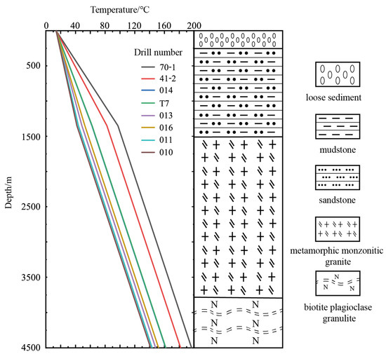 To investigate the deep high-temperature geothermal resource, multiple exploration wells were drilled in the Matouying geothermal field. The temperature logs of exploration wells with the lithologic feature are shown in Figure 2. The measured results indicate that there is a certain degree of heterogeneity in the geothermal gradient in the area, which generally shows that the change is relatively slow in the north and relatively large in the south offshore area. The Cenozoic geothermal gradient in the study area is 3.0–5.0 °C/hm, and the deep geothermal gradient is 3.2 °C/hm, which actually reflects the influence of thermal conductivity on geothermal gradient, as the thermal conductivity of granite and granulite is obviously higher than that of sandstone, mudstone, and loose sediment, generally. In fact, this phenomenon can also be observed in the drilling data of other geothermal fields, such as the Guide EGS field in Qingha, China, and the Feton Hill EGS field in New Mexico, USA. The maximum temperature 4000 m underground can reach 200 °C and the area where the temperature exceeds 150 °C exceeds 600 km2 in the study area. The reservoir lithology of the geothermal area from top to bottom is Quaternary loose sediment, Neogene mudstone–sandstone mixture, and Taikoo Temple formation metamorphic monzonitic granite and biotite plagioclase granulite.