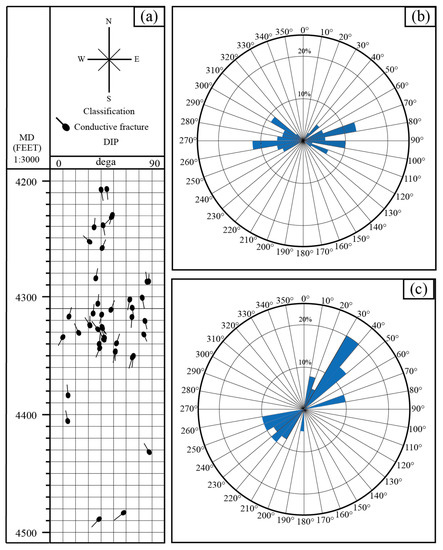 Natural occurring fractures in well M-2: (a) tadpole diagram of identified fractures, (b) fracture population dip azimuths, and (c) fracture population dip strikes.