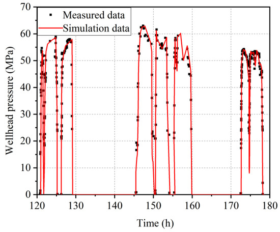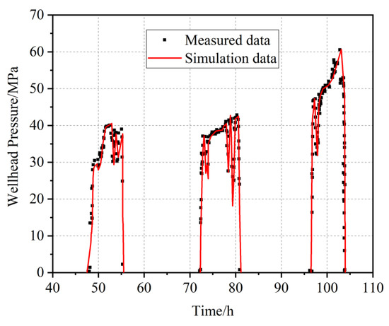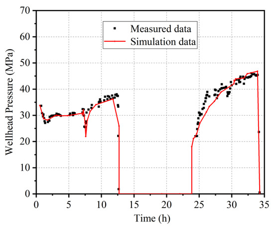 Reservoir fracturing mainly includes three stages; in the first stage, the water injection rate is 2.0–3.0 m3/min, which lasts for 2 days. As shown in Figure 6, the simulated curve is consistent with the measured head pressure curve. Within the first 7 h of the first day, the wellhead pressure was relatively stable, indicating at this stage that the hydraulic aperture of the conductive fractures in the reservoir gradually increased with the increase in water injection. However, in the eighth hour of the injection, the wellhead pressure showed an upward trend, and this trend continued to the end of the second day. It indicates that the hydraulic aperture of conductive fractures in the reservoir reaches the maximum under the action of in situ stress, but no new fractures are generated.